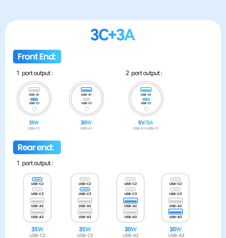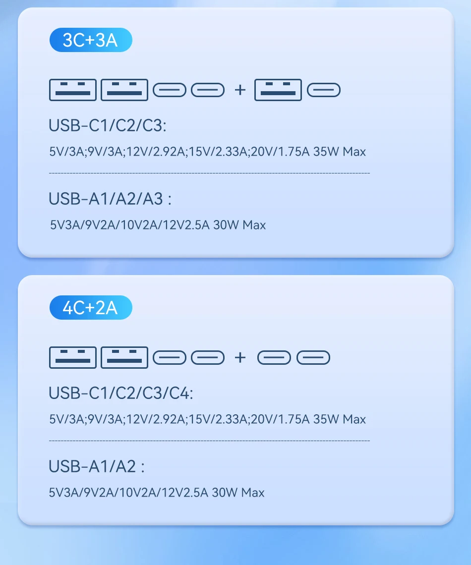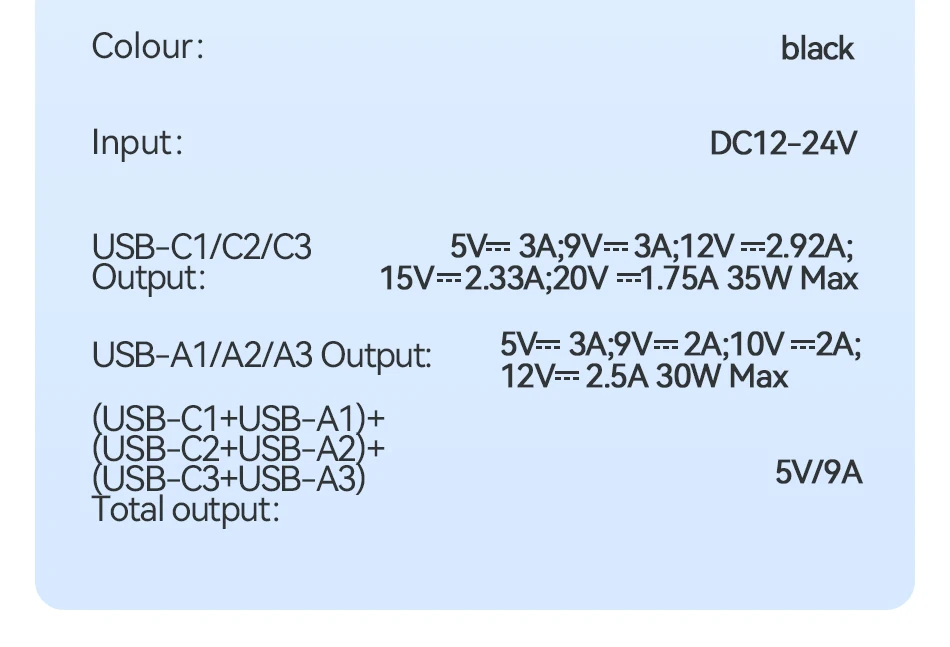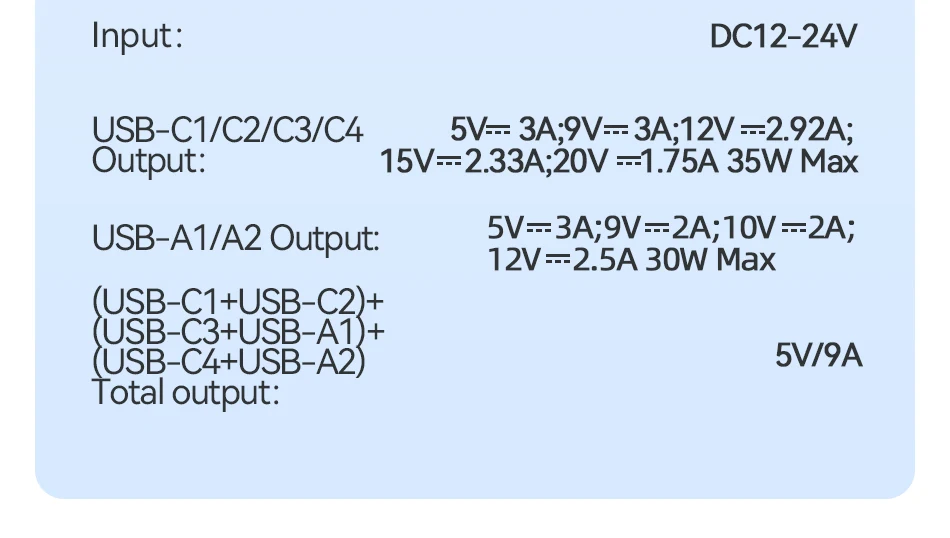 USB-C1/C2/C3 Output: 5V/3A; 9V/3A; 12V/2.92A; 15V/2.33A; 20V/1.75A 35W Max