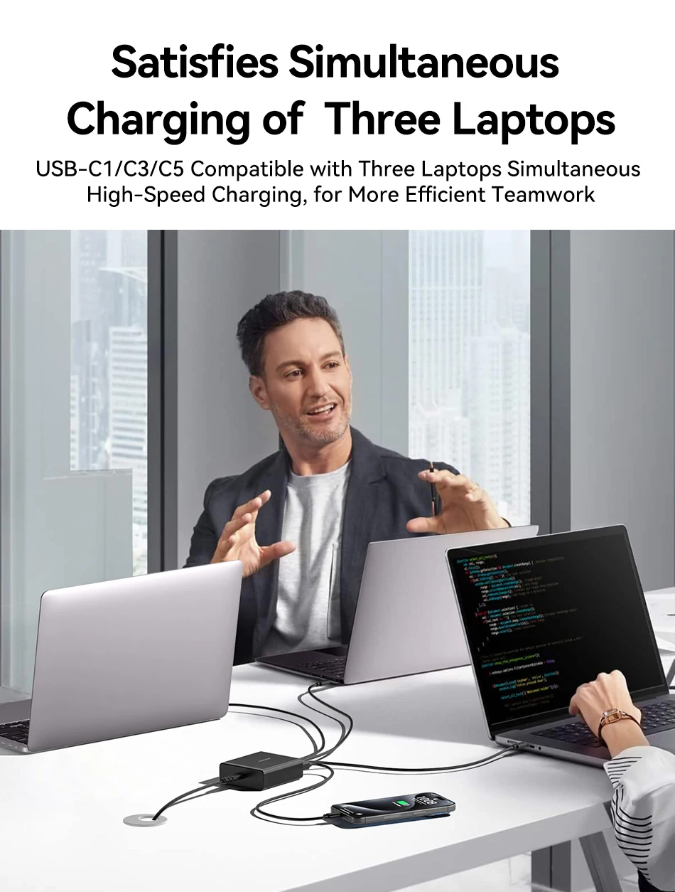 【200W USB C Charger】: This charger includes a large amount of simultaneous power ports for multiple devices. Such a multiport usb wall charger shares a total output of up to 200W with 6 USB-C ports and 2 USB-A ports.