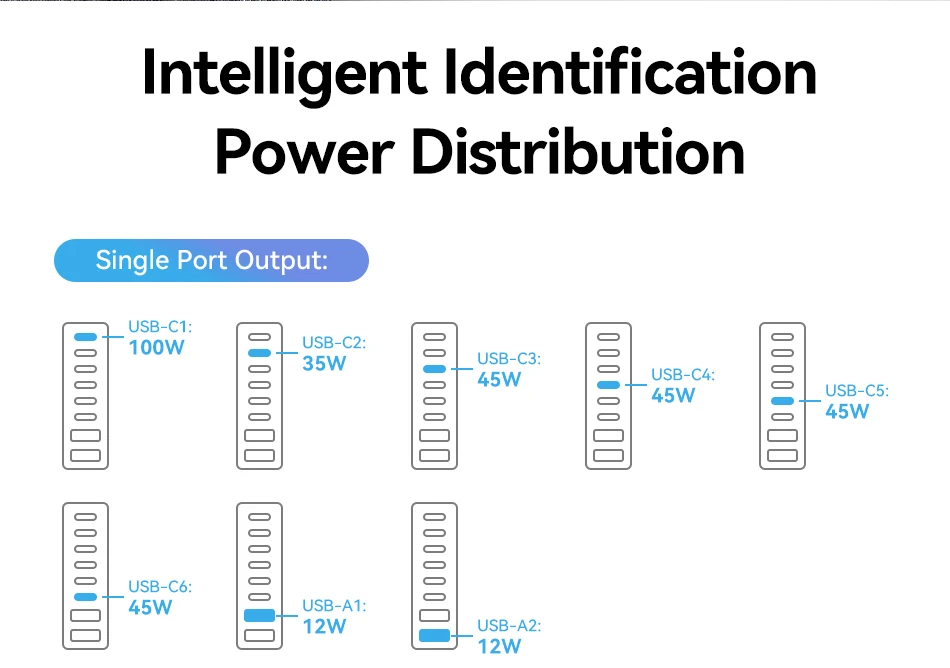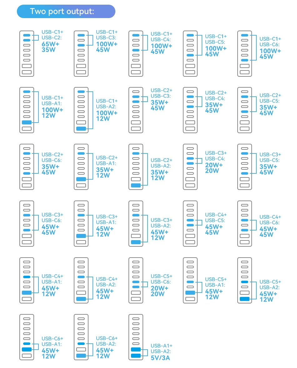 USB-C1+USB-C2+USB-C3+USB-C4+USB-C5+USB-C6+USB-A1+USB-A2 Total output: 200W Max