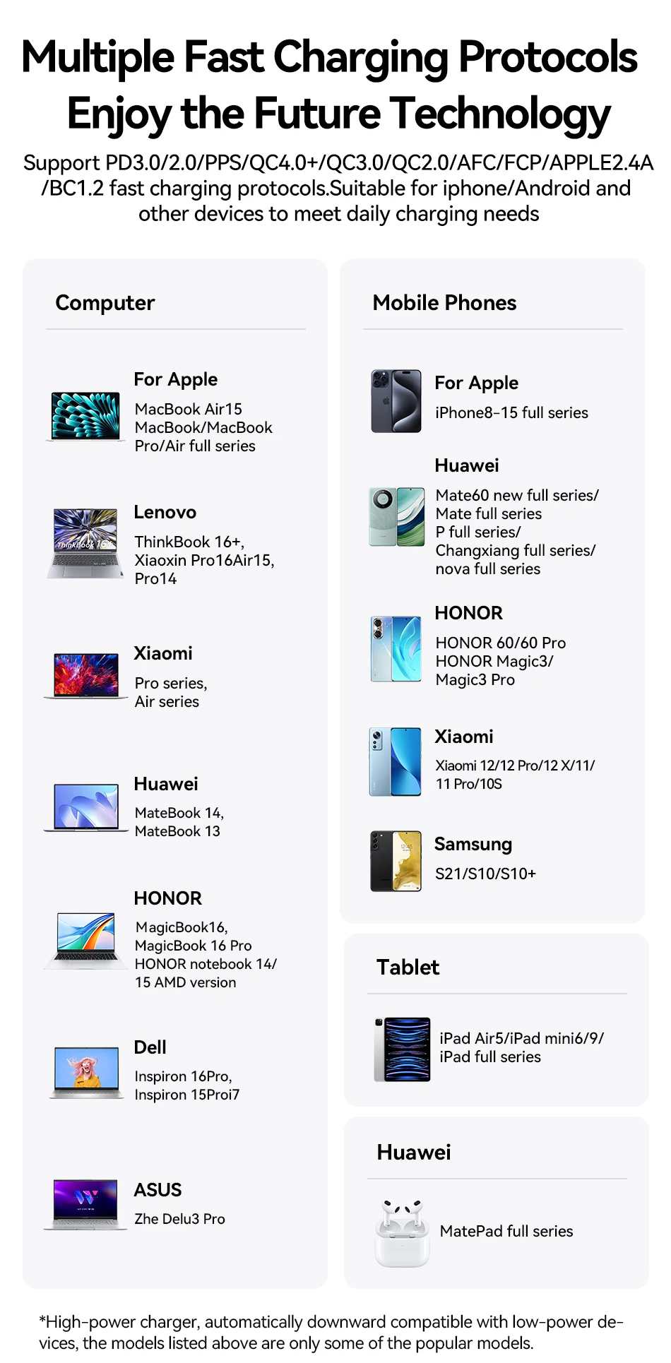【Widely Compatibility】:Work For Apple MacBook Air15 MacBook/MacBook Pro/Air full series;Lenovo(ThinkBook 16+, Xiaoxin Pro16Air15, Pro14);Xiaomi Pro series, Air series;Huawei MateBook 14, MateBook 13;HONOR MagicBook16, MagicBook 16 Pro HONOR notebook 14/15 AMD version;Dell Inspiron 16Pro, Inspiron 15Proi7;ASUS Zhe Delu3 Pro;Mobile Phones For Apple iPhone8-15 full series;Huawei Mate60 new full series/Mate full series P full series/Changxiang full series/ nova full series;HONOR 60/60 Pro HONOR Magic3/ Magic3 Pro;Xiaomi 12/12 Pro/12X/11/11 Pro/10S;Samsung S21/S10/S10+;Tablet for iPad Air5/iPad mini6/9/ iPad full series;Huawei MatePad full series。